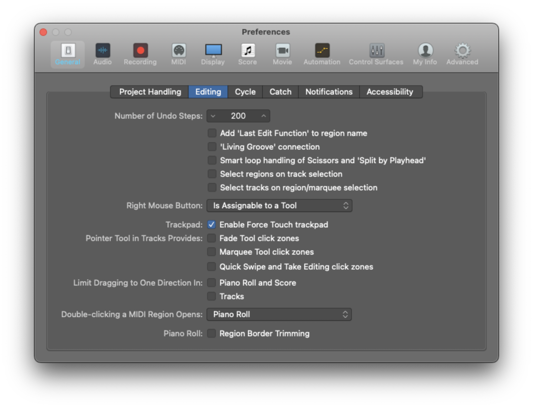 On Logic pro X 10.6.1 / Big Sur 11.2.3 - i can't find the option, to command right mouse click, to tool menu. On preferences/general/editing - in this menu is supposed to be possible choose what you want to do with the right mouse click, and in this place i don't have any option.