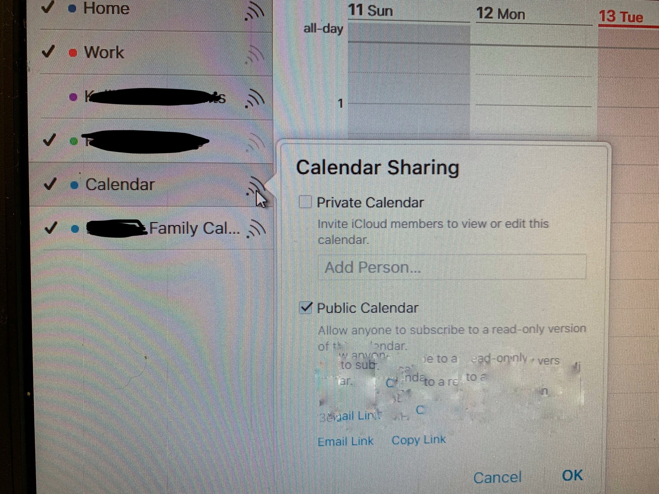 My family uses the Cozi app, and we have successfully added our individual Apple calendars. I am wondering if there is a way to add a shared Apple calendar? When I click on the shared calendar, I do not get the option to make the calendar Private or Public like I do with other calendars (see pics). Since the shared calendar is technically a distinct calendar, shouldn't it have its own URL?