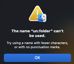 Did you receive a warning dialog from the Finder that looks like the following when attempting to use an illegal colon character in a file or folder name?
