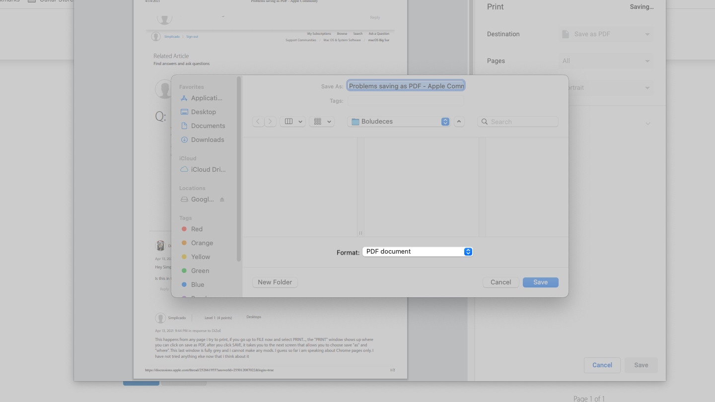 This happens from any page i try to print, if you go up to FILE now and select PRINT..., the "PRINT" window shows up where you can click on save as PDF, after you click SAVE, it takes you to the next screen that allows you to choose save "as" and "where". This last window is fully grey and i cannot make any mods. I guess so far i am speaking about Chrome pages only. I have not tried anything else now that i think about it