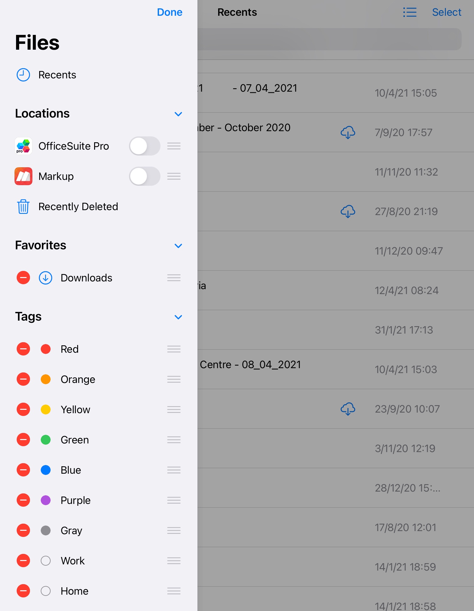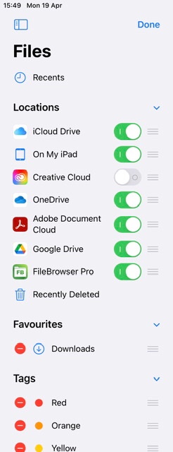 What appears to be missing from the screenshot are many of the “locations” in which your files may be found. Tap the ellipsis icon (...) - and then the Edit Sidebar option. From here you can enable/disable various file locations - which may look a little like this...