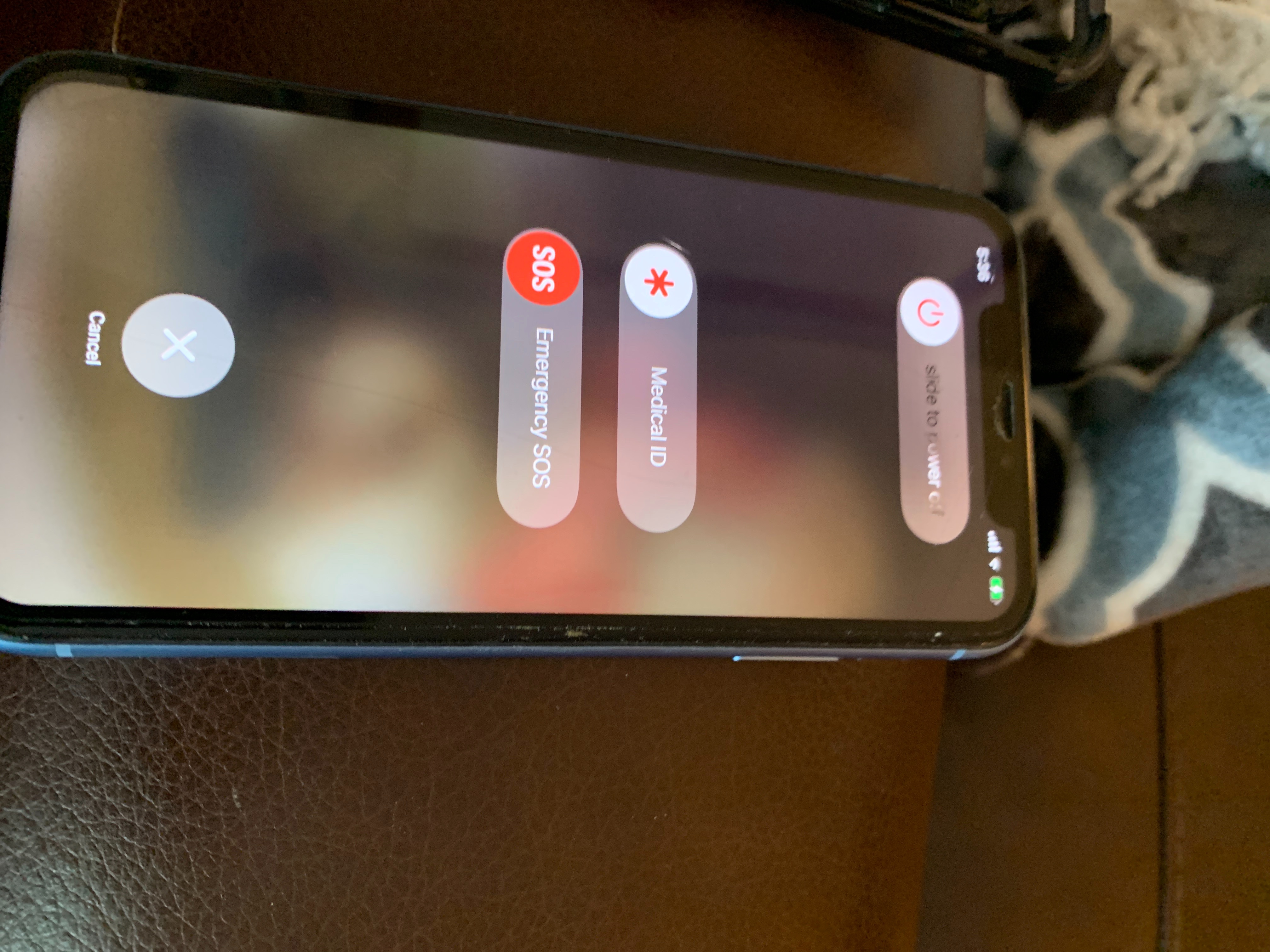 iPhone XR frozen on screen that has: power off slide, medical ID, emergency sos and “X” cancel circle.