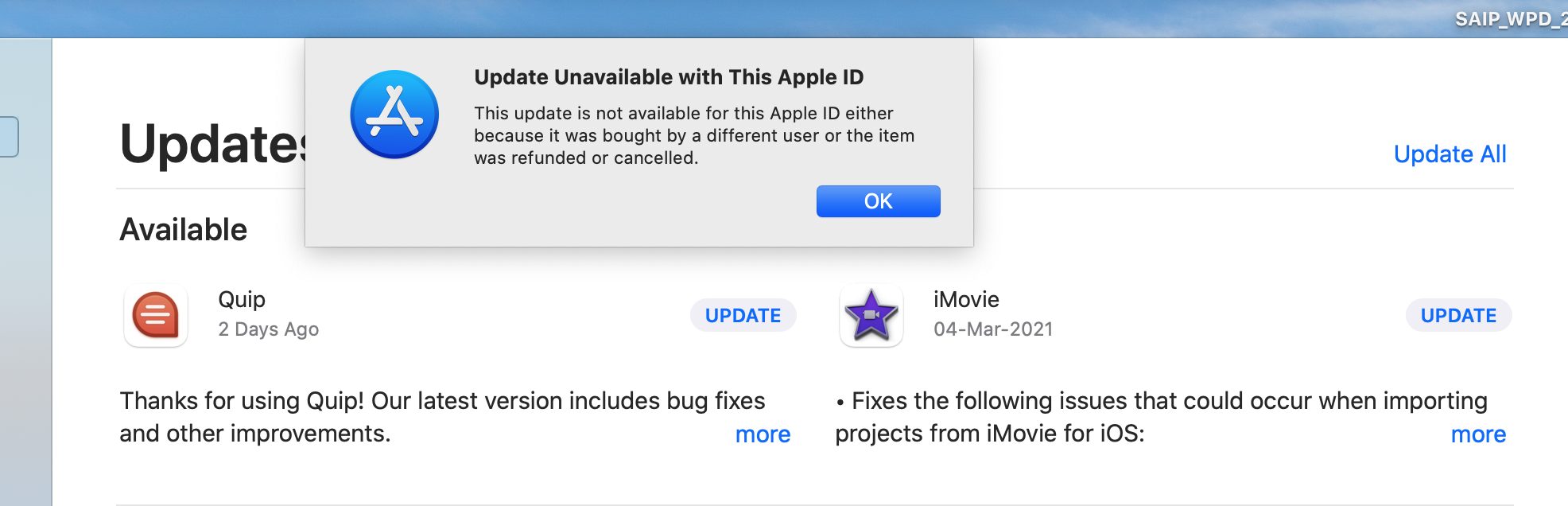 I get the message "This update is not available for this appleID either because it was bought by a different user or the item was refunded or cancelled"