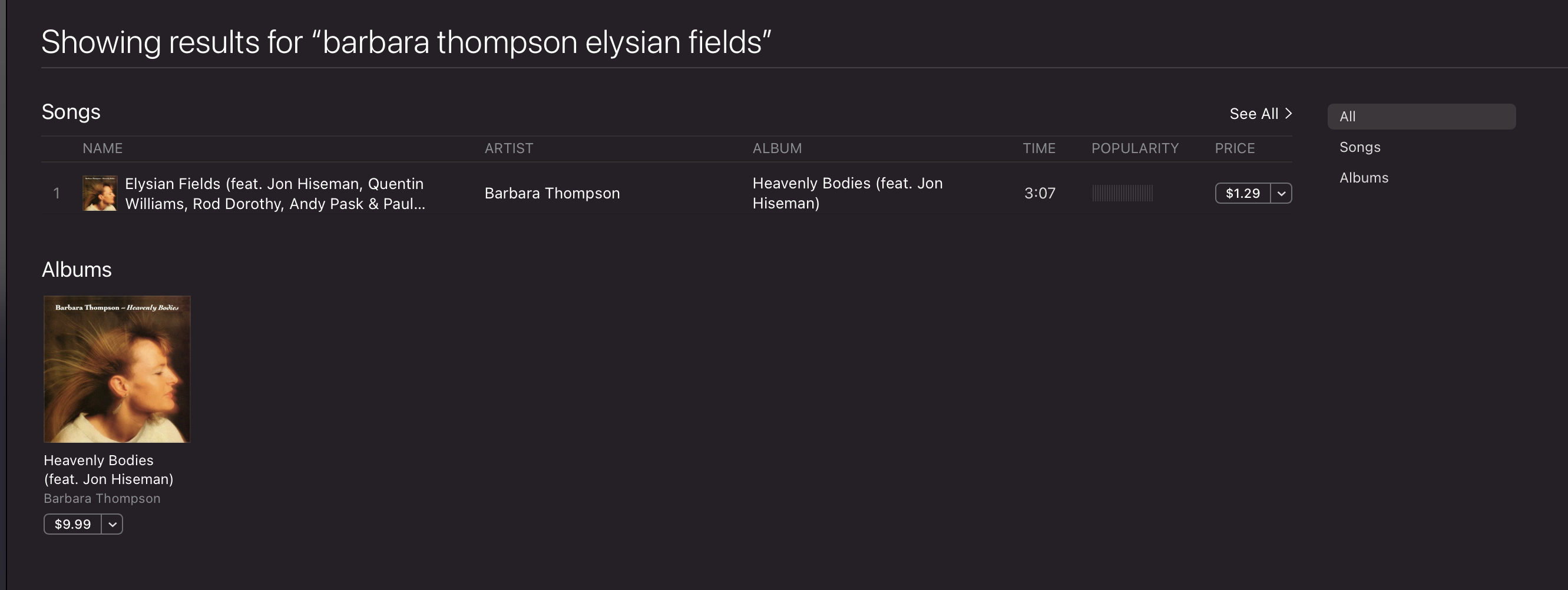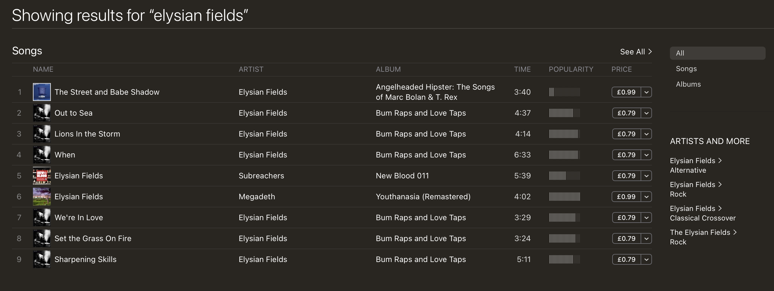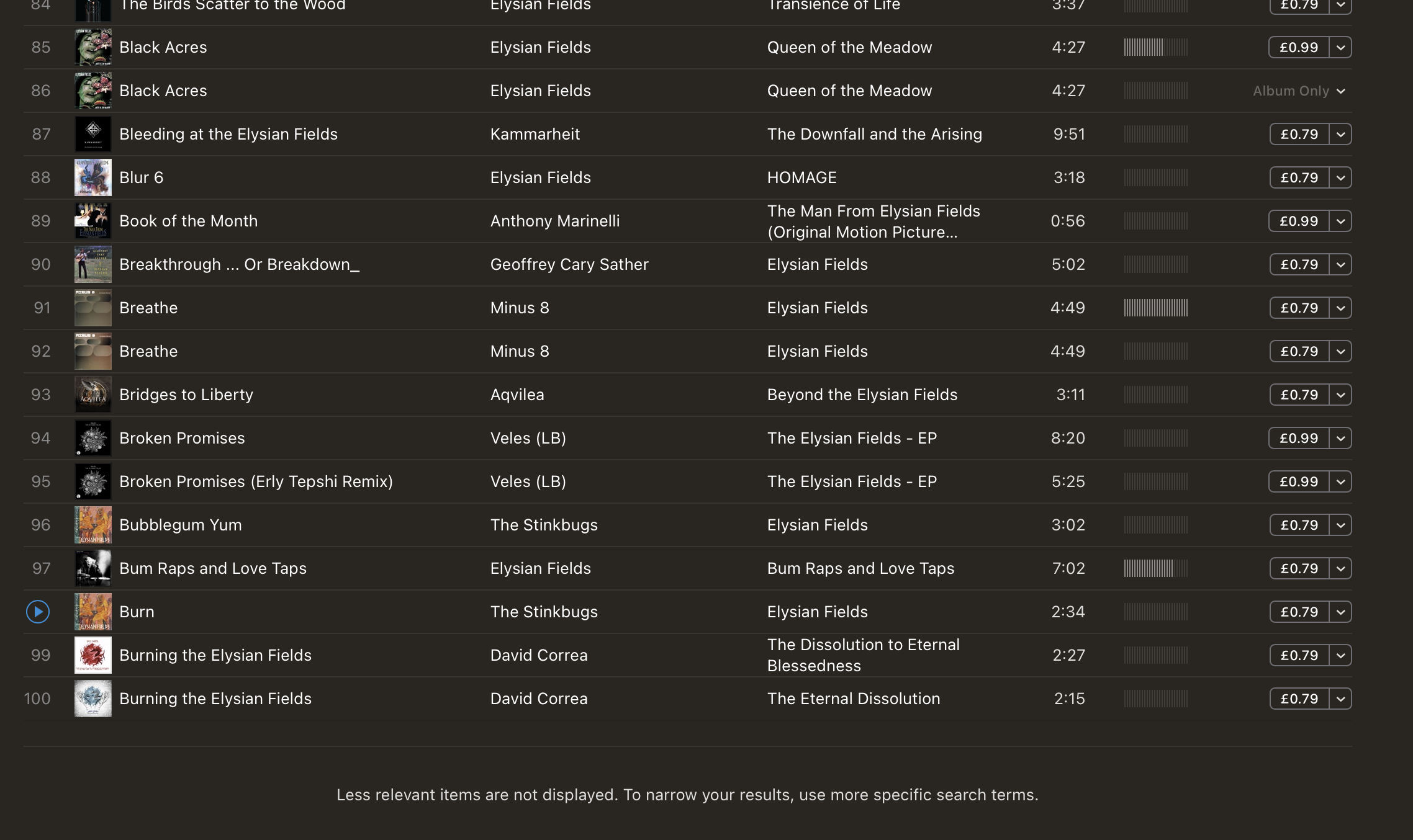 And the first 100 results on my iTunes search get me as far as B, for 'Burning the Elysian Fields', so I can't get to C, or D or the crucial one E !!! so i can't actually find a song called Elysian Fields. which does exist. And its an instrumental, so nothing to do with lyrics, and since one of the biggest music catalogues on the web is iTunes, I'd thought this would be the best place to start.