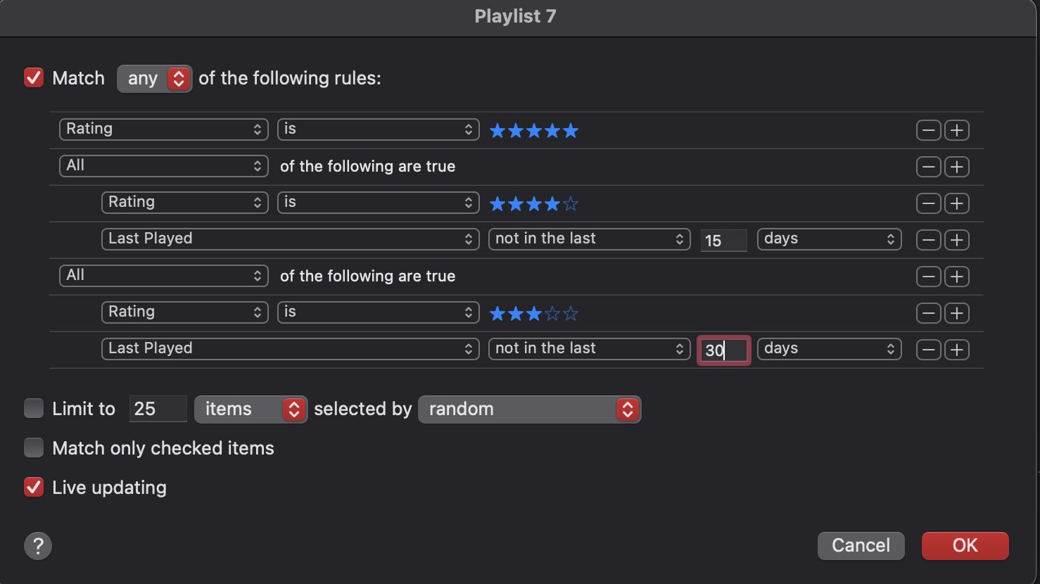 But since the update to Big Sur and the shift from iTunes to Music, the master playlist no longer updates. The answers I've seen here suggest that if a rule causes a song to be removed from or added to the playlist, it will update, but what's actually happening is that the AND playlists are updating and the master OR playlist is not, because none of its rules apply to any specific song.