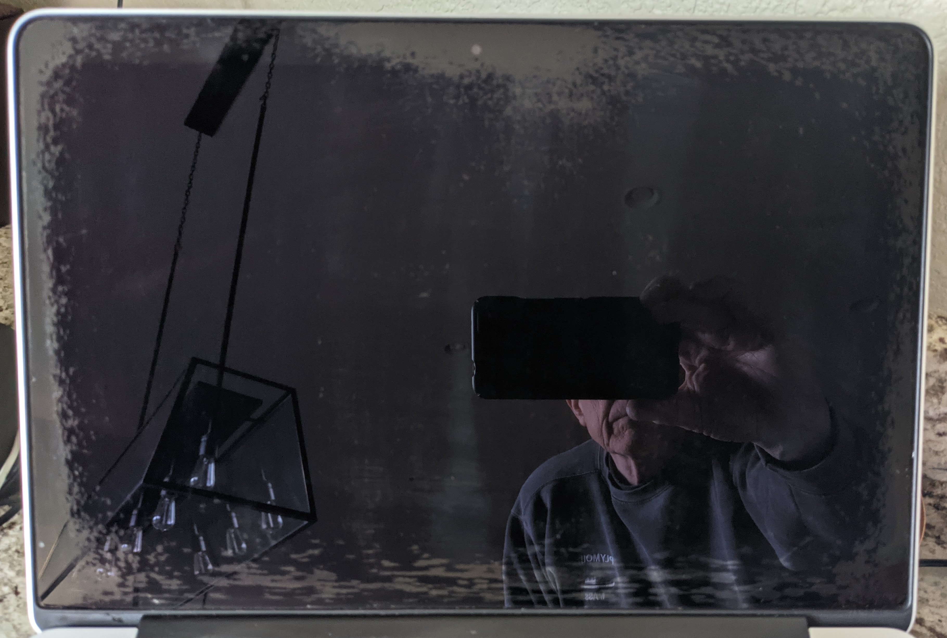 My mid-2014 MacBook Pro 13 inch screen has a cloudy, somewhat jagged edge on all four edges of the display when the computer is completely shutdown. When the computer is on, the screen appears normal and fully usable. Is the screen delaminating? Or something else? I apologize for the picture but since the screen is so reflective I couldn't find an angle that didn't include something. :-)