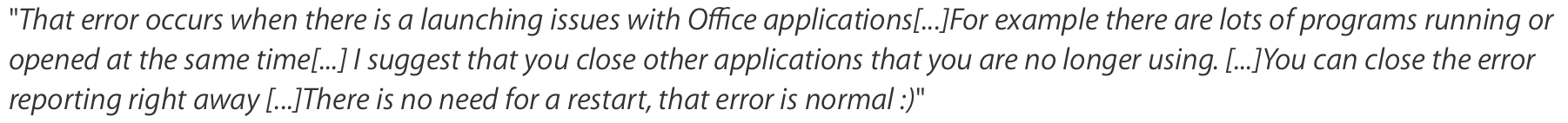 "[...]Thanks for the question on Apple Support Communities today. It appears you have a pop-up notification from Microsoft Office software installed on your Mac. It could be that the Microsoft Office software was in the middle of an update when you shut your Mac down. We'd need to direct you to Microsoft to find out exactly what happened and if there would be any issues with the software at this point[...]"