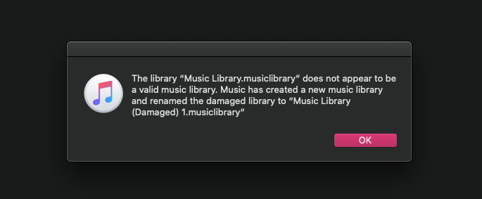 'The library “Music Library (Damaged).musiclibrary” does not appear to be a valid music library. Music has created a new music library and renamed the damaged library to “Music Library (Damaged) (Damaged).musiclibrary”, after which I pressed 'ok' (it's the only option given...).