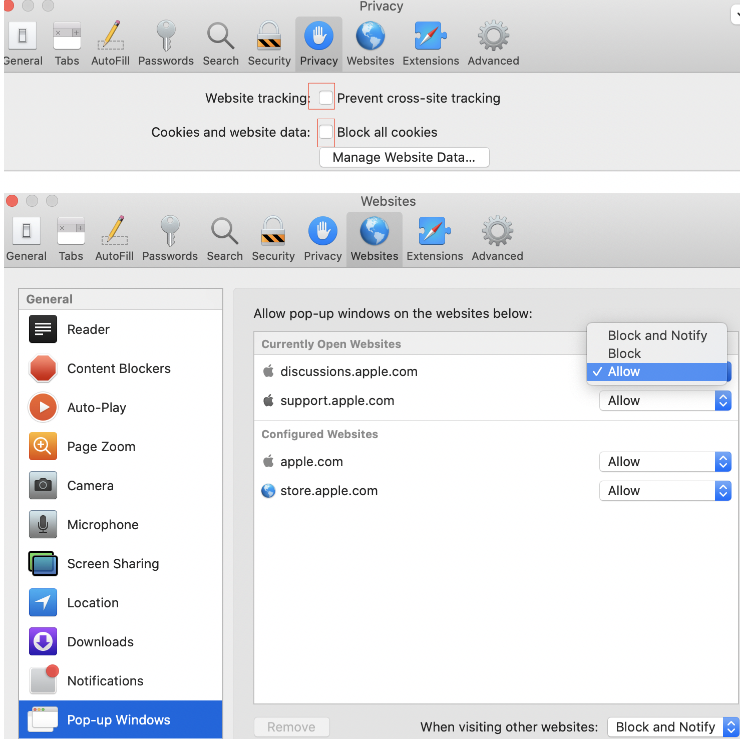 When I go under safari preferences, it says that my cookies are unblocked but websites still say they are blocked. This is happening on both of the MacBook Air's my family has. How do I fix this?