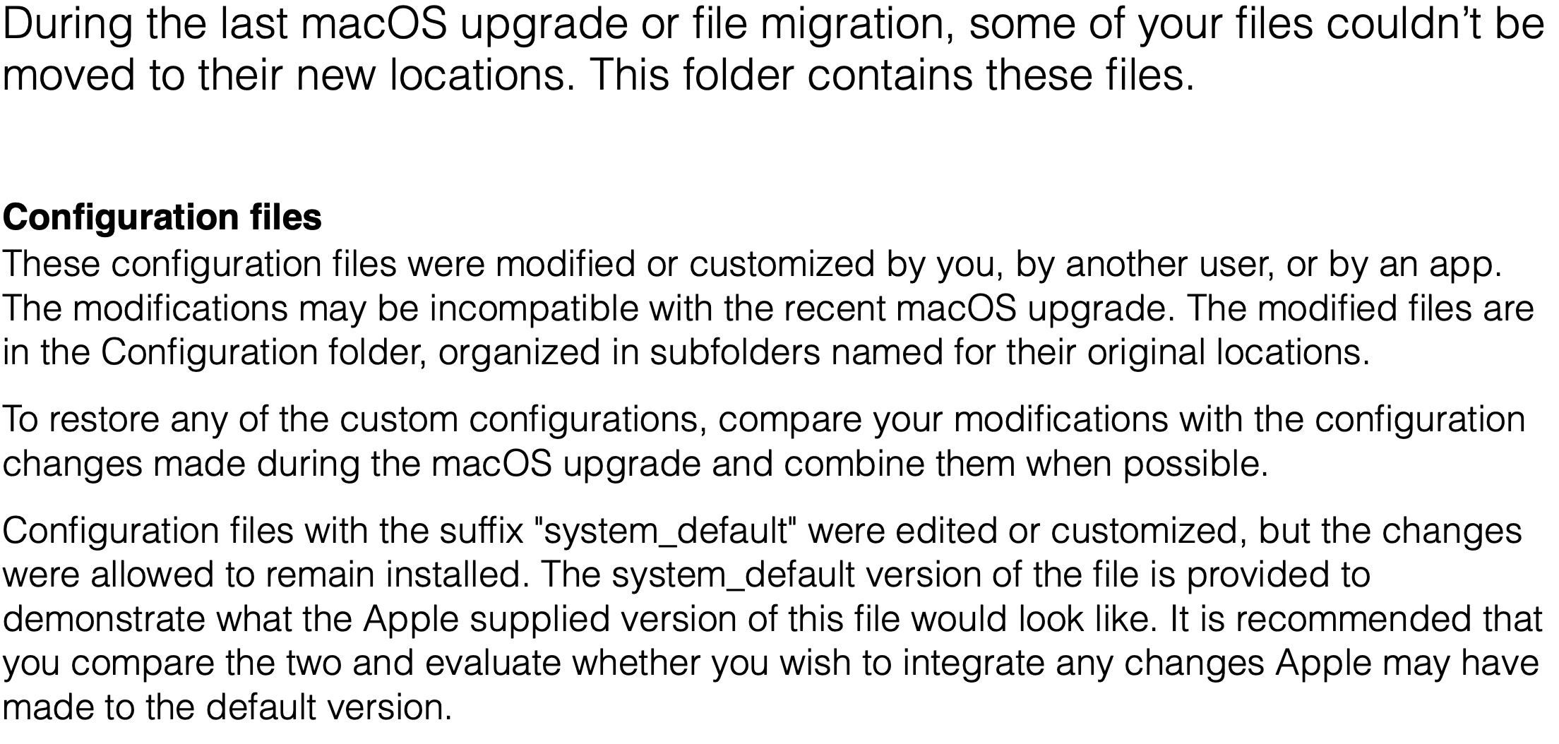So i have a strange folder on my desktop after latest update called Relocated Items, but darn if i know what this is , inside is a folder configuration with another folder called private and then another one inside private called ETC with a document i cant open called group.system_default that says There is no application set to open the document leaving me not even knowing what this is . any help appreciated thanks much.