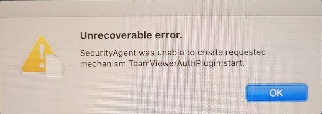 This issue can be caused by deleting an authorization plugin on macOS (in this case, TeamViewerAuthPlugin.bundle) without de-registering it first. It is recommended to uninstall it through the above process . This makes sure that the plugin is properly de-registered before deletion.