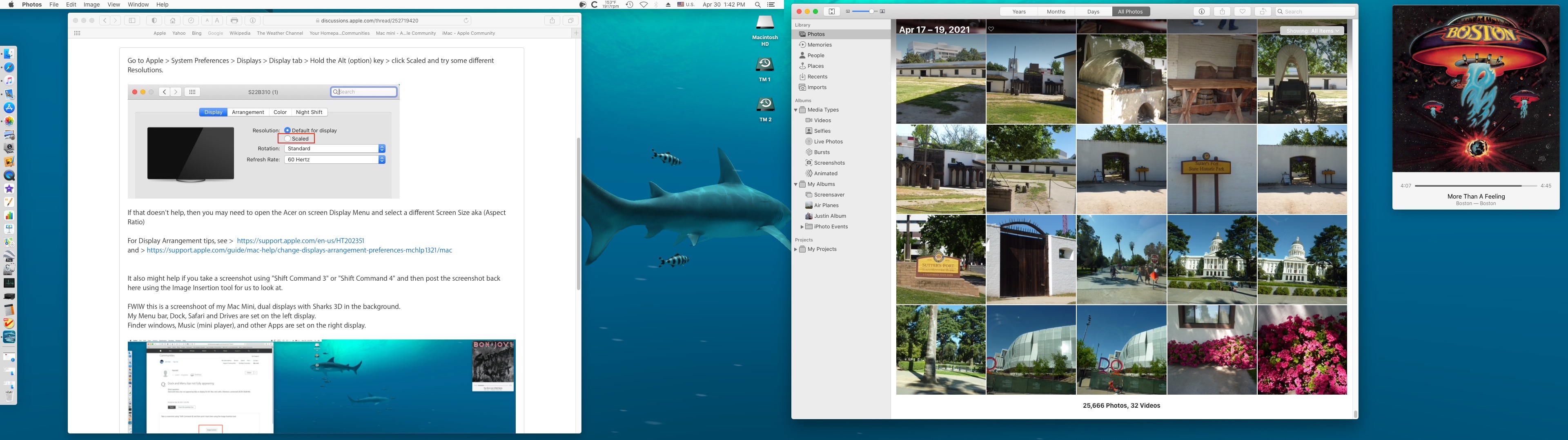 Finder windows, Music (mini player), Photos and other Apps are set on the right display.