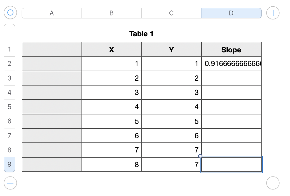 I am using the LINEST function to calculate the slope of best fit line of x:y data arranged in two columns.