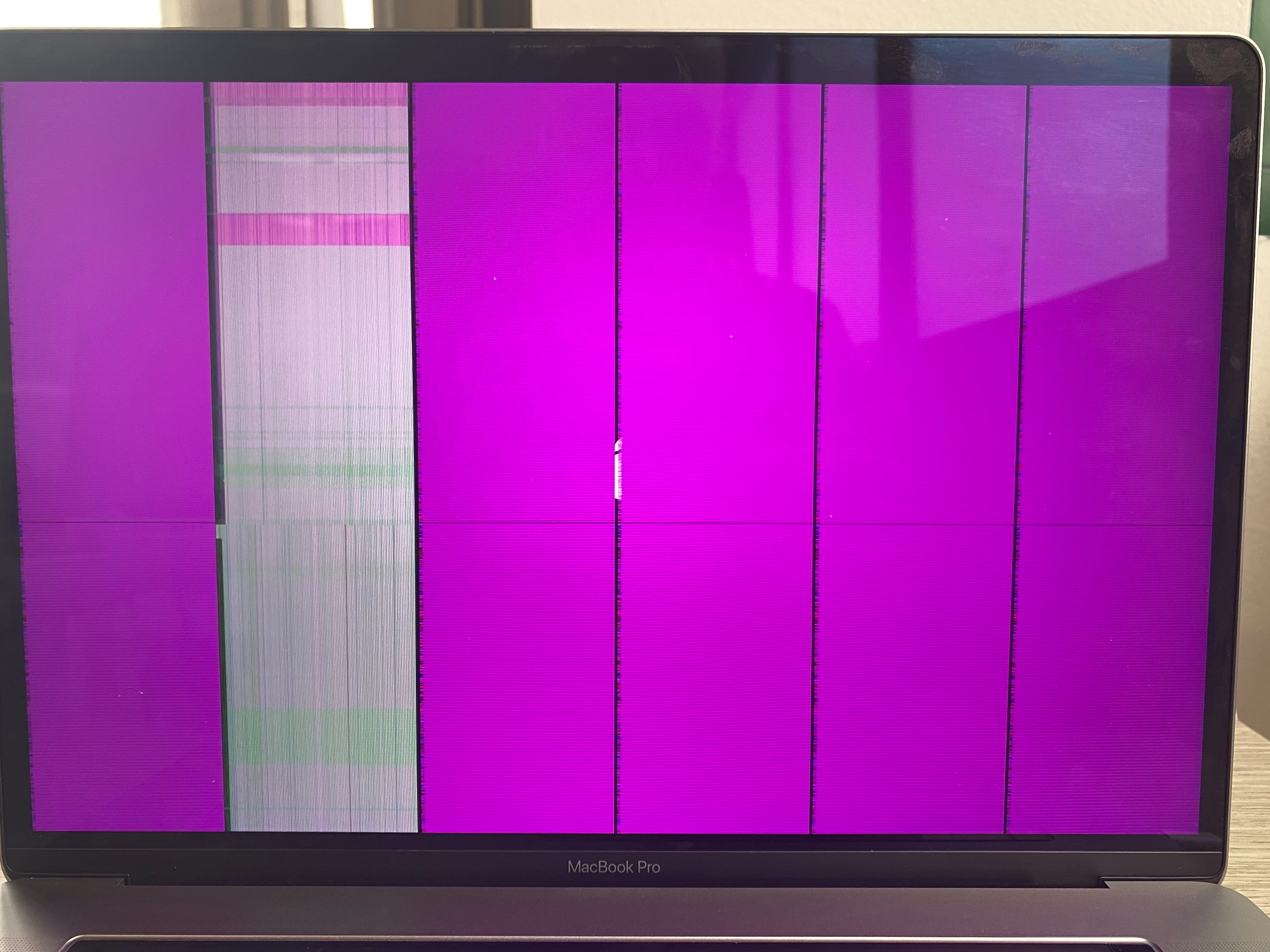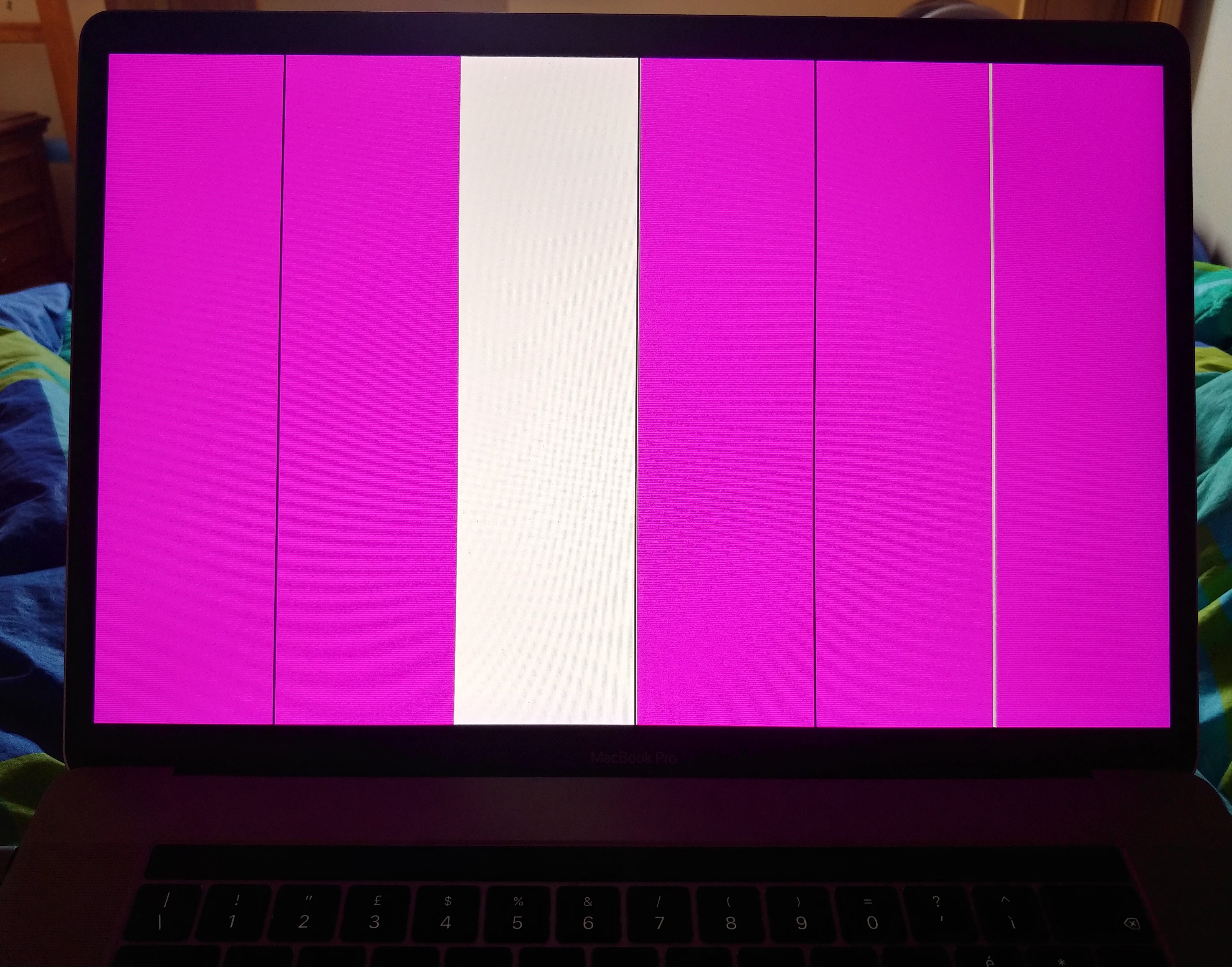 This is my Macbook Pro 15, 2018 model bought in November 2018. Completely unusable display with pink - magenta bars covering it. Always treated with great care. My local Apple service center asks hundreds of euros to repair.