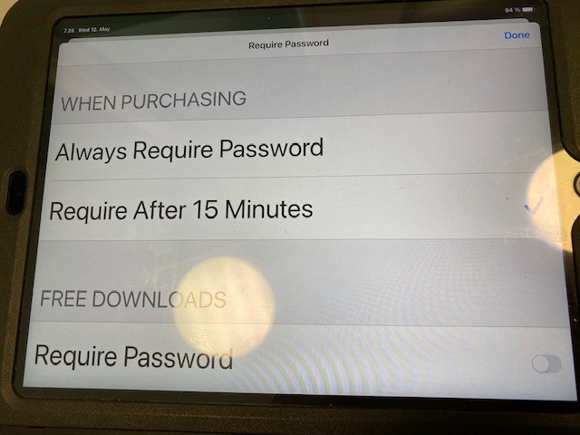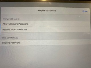 I noticed, that in all the ipads when you enlarge the text as you suggested, the selection boxes do appear, but on default they all show that the "require passcode" selection would be off, even though it is on in most of our ipads (in 2/6 of our Ipads I found out now it wasn't asking a password for free purchases, but in 4/6 it was, still the selections all look like as in the picture below).