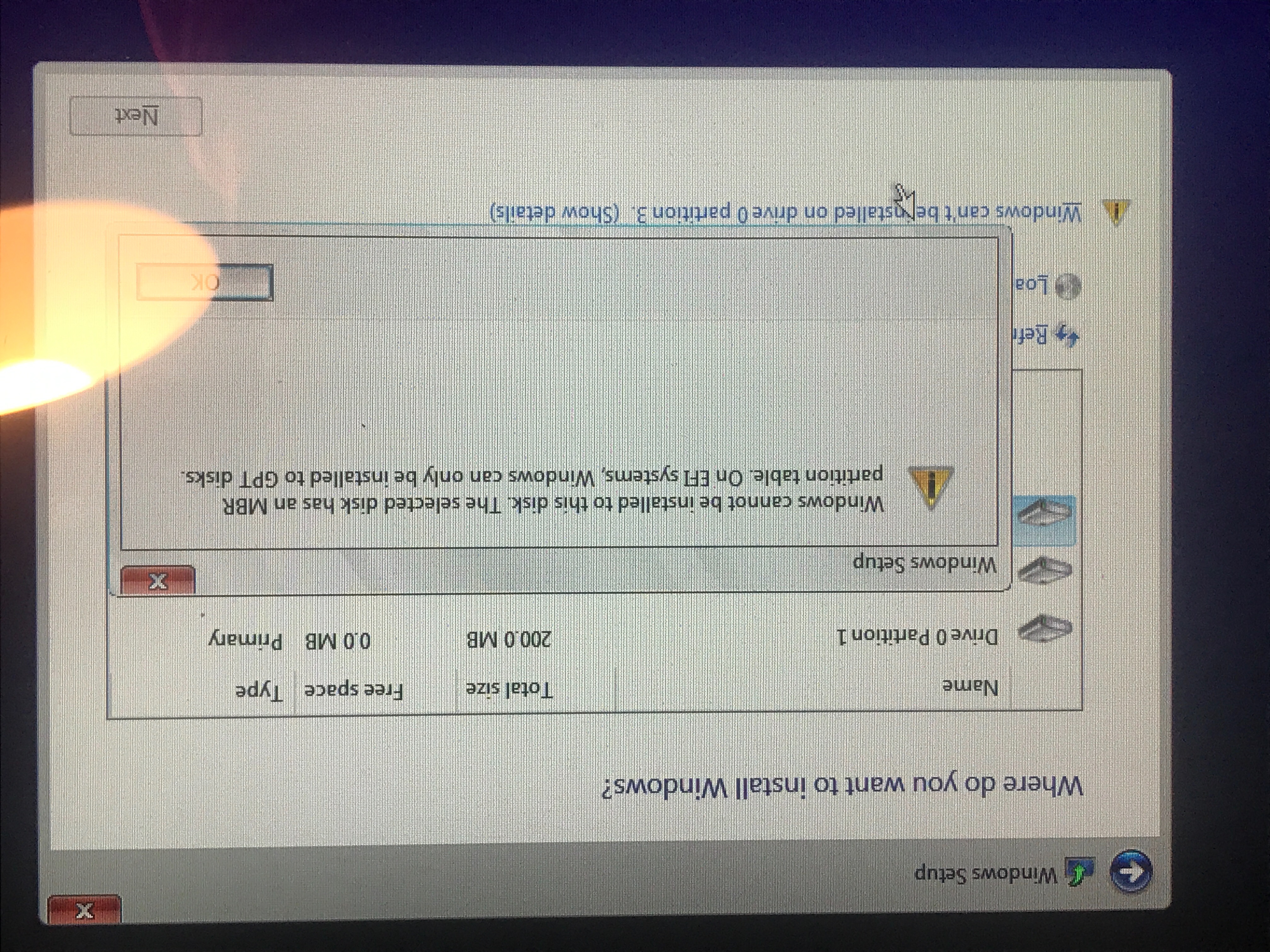 Now however, when loaded into the windows setup i was asked to select the partition to boot windows off of and get this message
