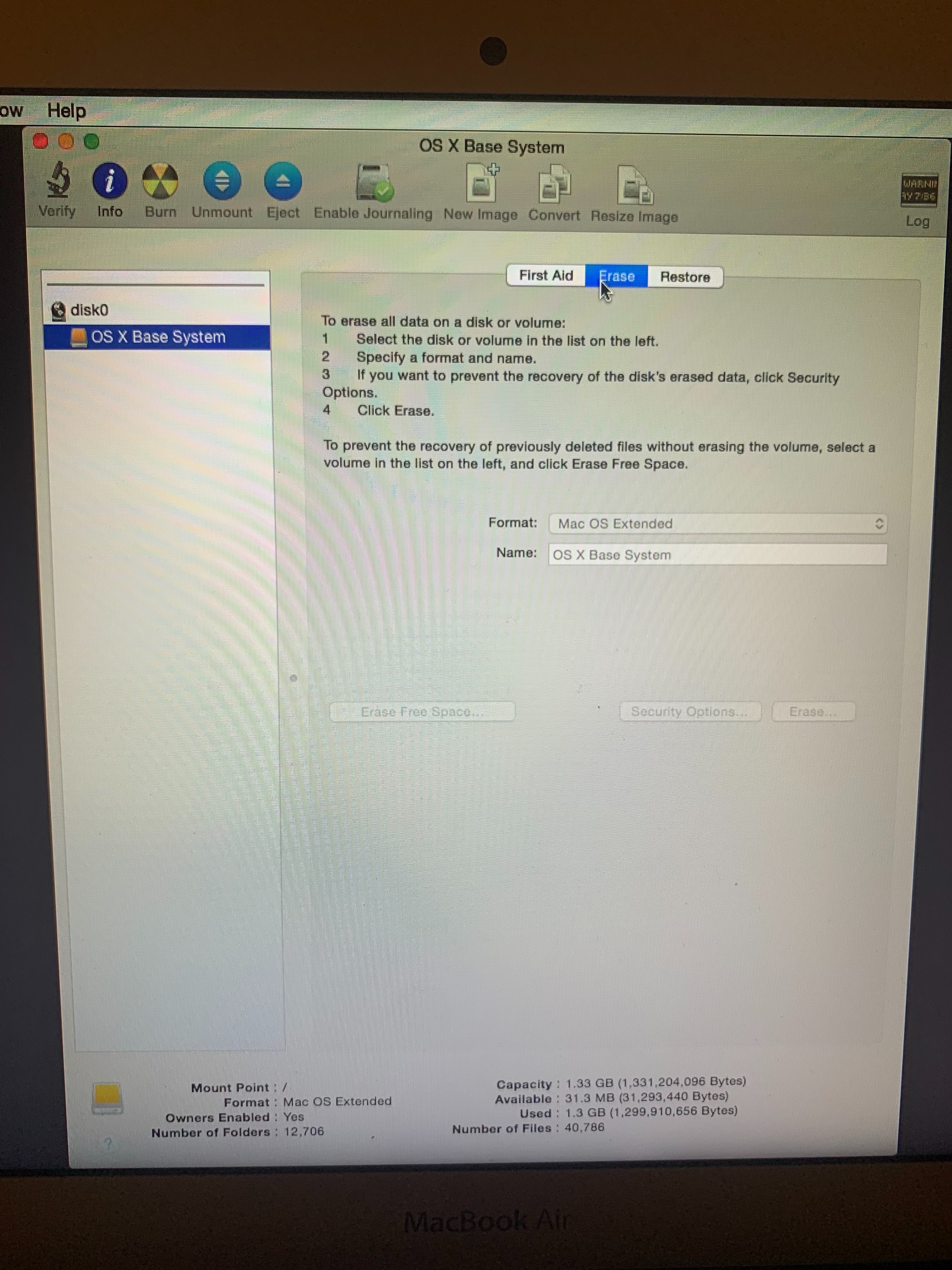I was trying to reset the Macbook because I had forgot my password but somehow it messed up the disk. Now I am in Disk Utility in recovery mode to try to reinstall a new copy of OS X but there’s no disk for me to select. Disk Utility is showing disk0 and OS X Base Sytem, not Macintosh HD. I’ve seen people say to just erase the OS X Base System but the option to erase is greyed out. Not sure what to do now.