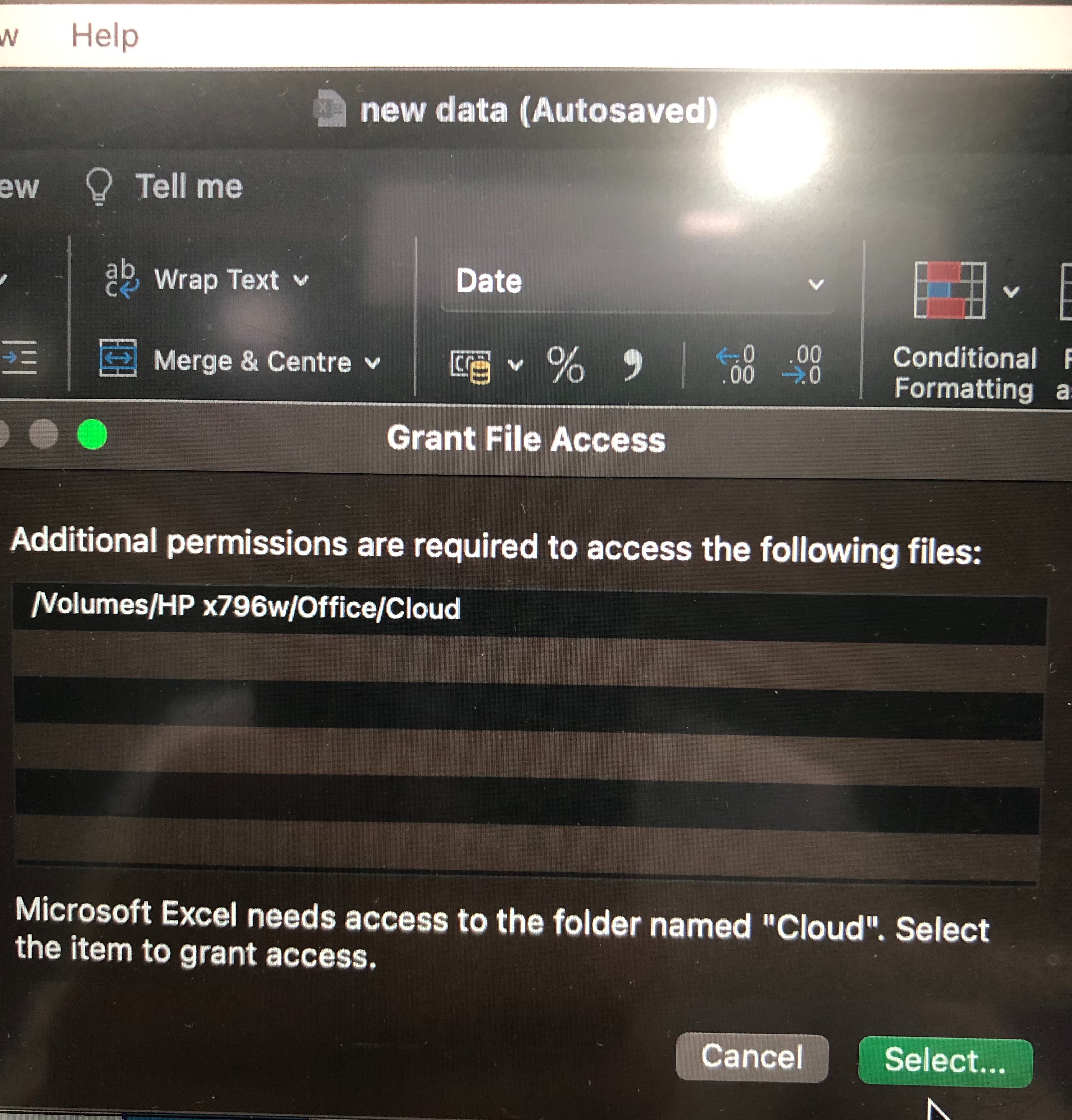 Close all open programs. See if the file is visible in the Finder. Make sure your Finder menu -> Preferences -> has External Disks checked. If the HP drive does not show on the desktop, use Disk Utility in Applications -> Utilities to make sure it is mounted.