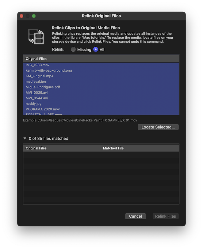 Select either Missing, or All. In this case, I suppose you may want to select "All" so every clip in your library points to the new location. Select all the files in the list, and click Locate Selected...
