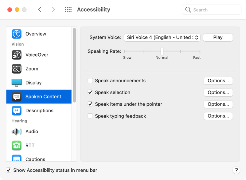When I turn on "Speak items under the pointer" in System Preferences > Accessibility > Spoken Content with the Option to Speak item under the pointer [ Always ],