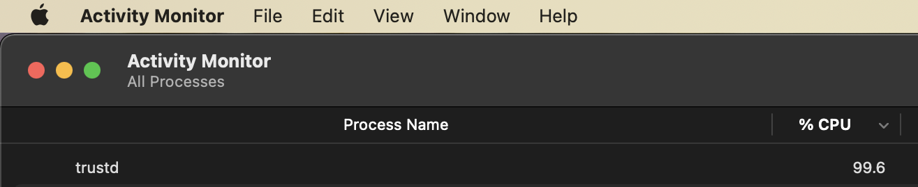 Then rename valid.sqilte3 to valid.sqlite. You should notice another valid.sqlite3 will pop up. After that, trustd will not hog the CPU and the fan will slow down.