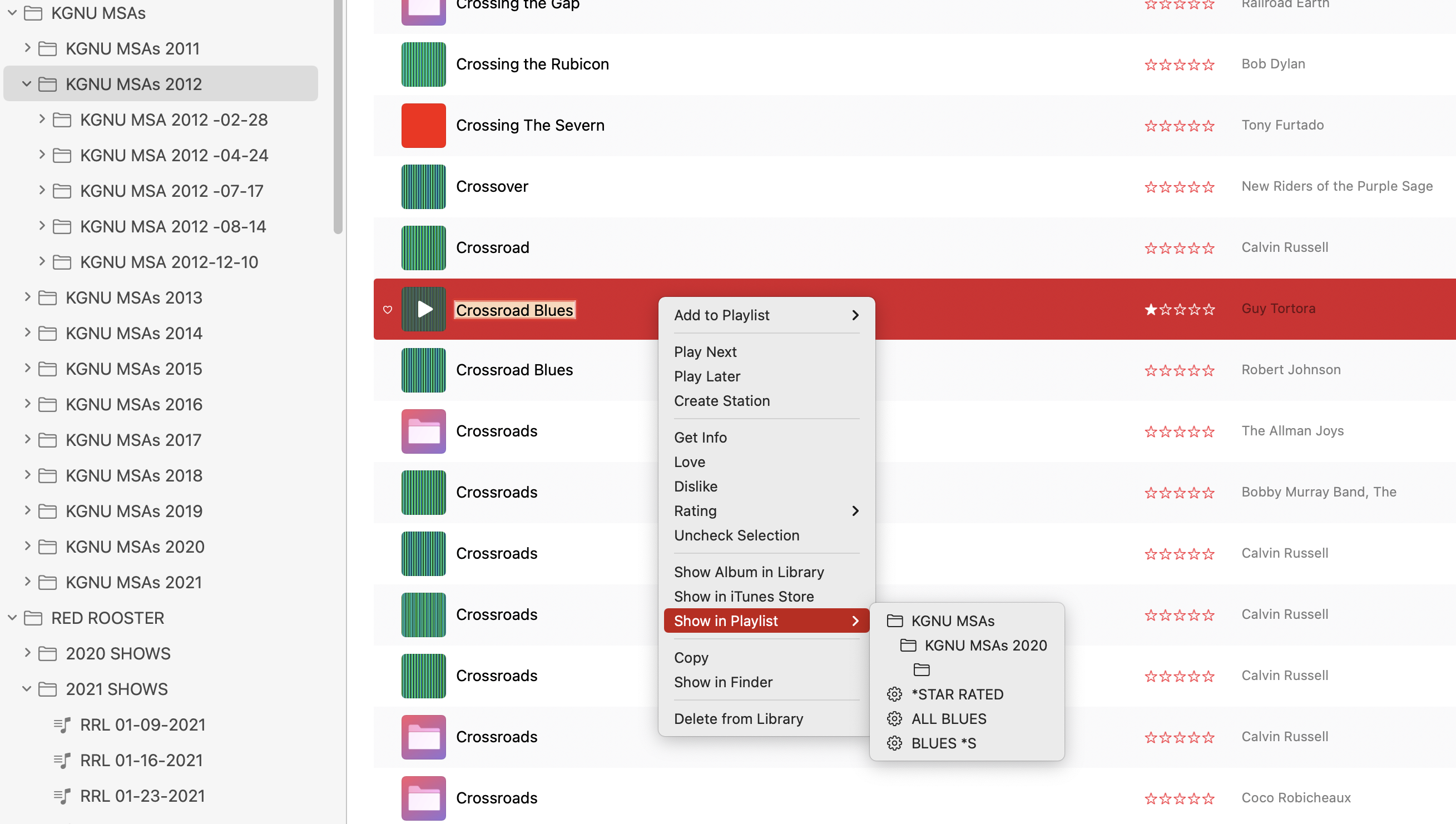 Since the update to Music version 1.1.4.110 I am getting some strange behavior. Several blank folders appeared out of nowhere. Also songs now appear in folders I never put them in. In the attached screen shot, the song "Crossroad Blues" by Guy Tortora — which I just added a couple days ago — shows up in a radio playlist folder I created in 2012. As you can see, when I ctrl-clicked on the song it shows it as being in KGNU MSAs > KGNU MSAs 2020 > [blank folder]. It doesn't belong in either of those named folders and where did that weird blank one come from? Something funky is going on.