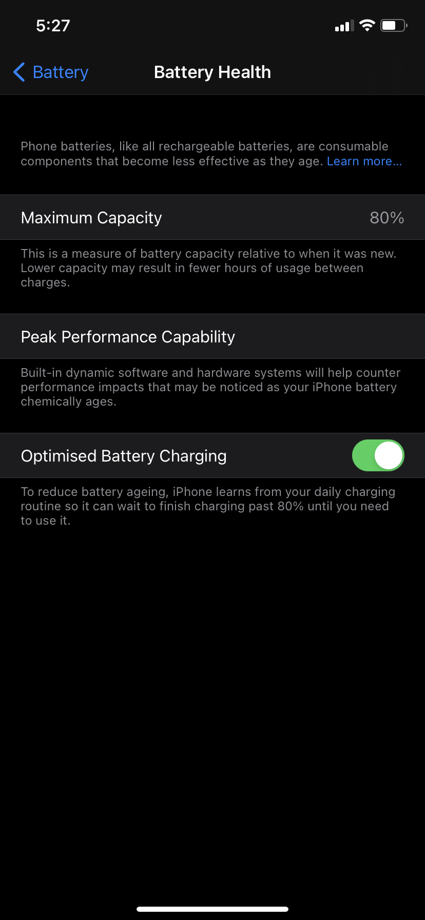 Battery health varies with usage and all batteries degrade over time. At 80%, it is time to have a new battery installed.