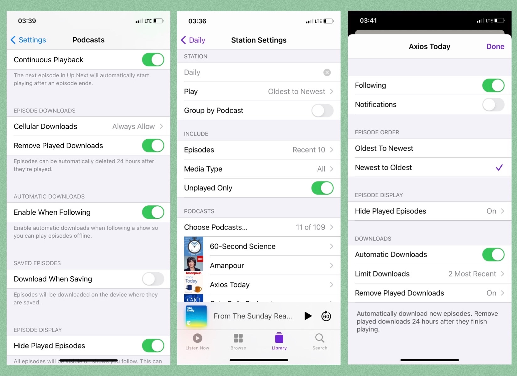 The pic below shows the Podcasts app settings at iPhone Settings>Podcasts (left frame), the Station settings (middle) and the Show settings (right). Disregard the options selected. Choose your permutations as you wish.