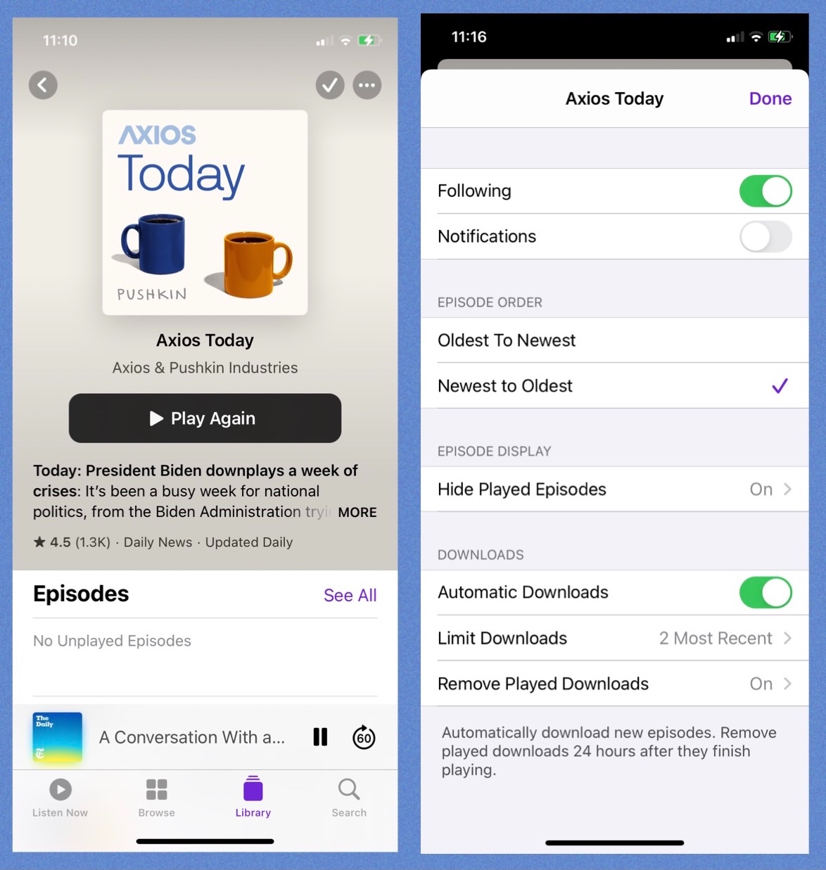 Long ago it would do this automatically. But then for some reason after I updated to 14.1 I had to manually delete all the non-played episodes I didn't want. I don't have cellular or wi-fi on for the app because when I did and then loaded the app all the work of deleting the listings would be undone and I'd have to do it again!