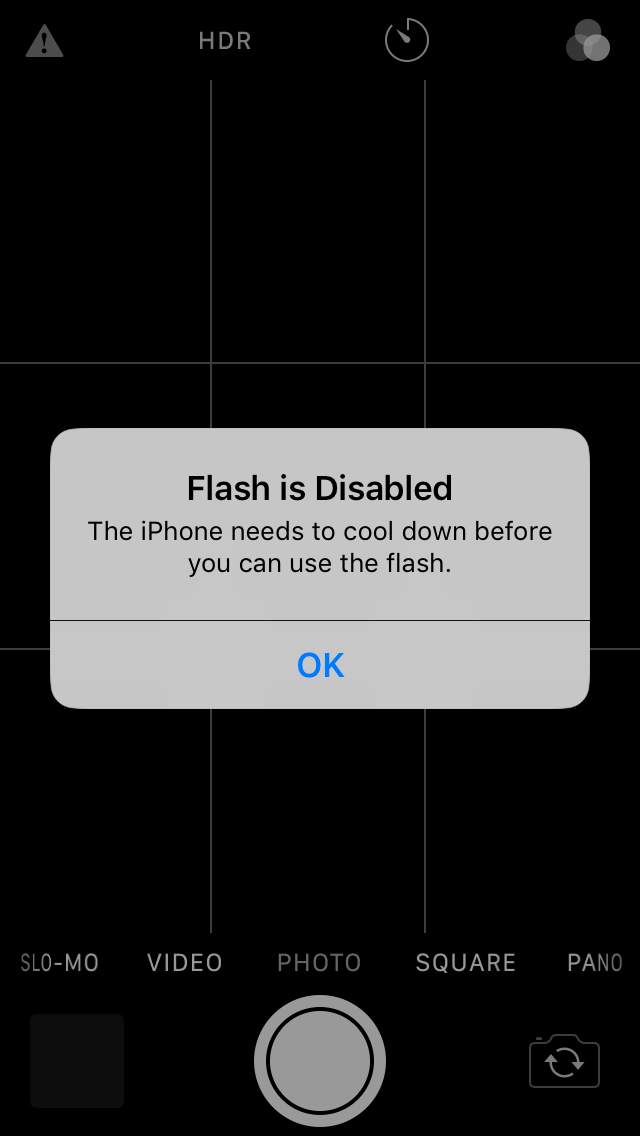 when opening my iPhone 5s rear camera ,iPhone shows black screen and caution symbol in flash .touch that symbol shows a message “flash is disabled”.