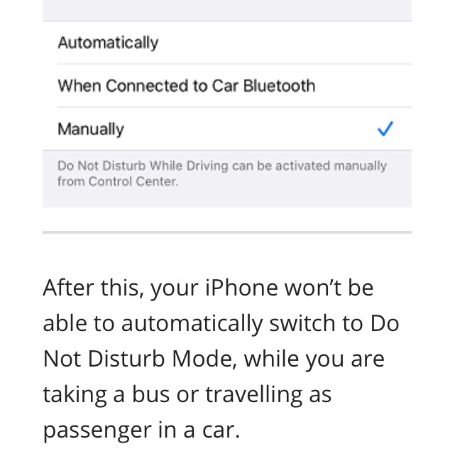 So I went into Settings, and Do not disturb. Unfortunately I can set Do not disturb while driving, to “Manually, because it is not an option. I also have no idea how turning on screen time would enable this. All that screen time does, is indicate to me the amount of time I am using my phone. I am using an iPhone 7. How can I permanently turn this off.