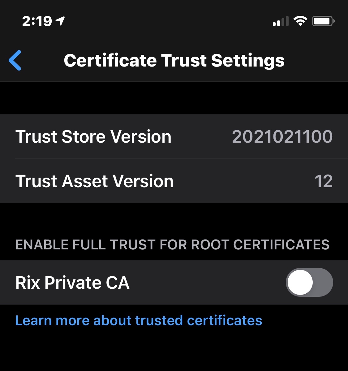 If you want to turn on SSL trust for that certificate, go to Settings > General > About > Certificate Trust Settings. Under "Enable full trust for root certificates," turn on trust for the certificate. Apple recommends deploying certificates via Apple Configurator or Mobile Device Management (MDM).
