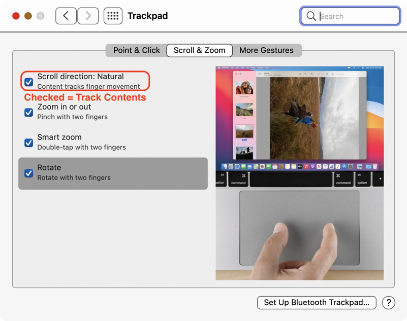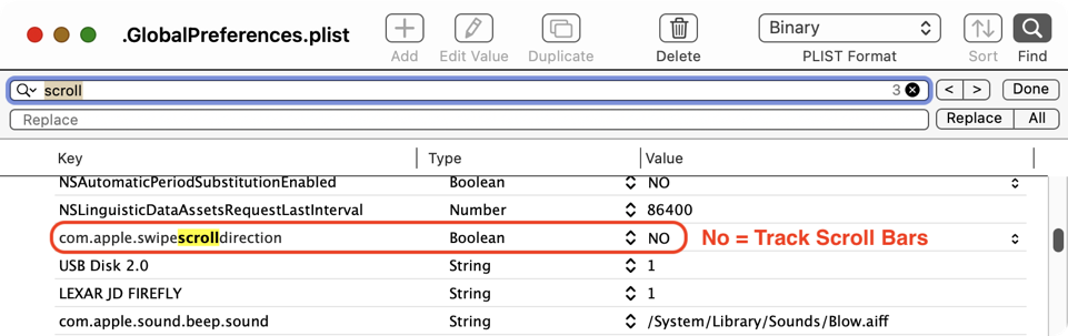 NOT Natural scrolling, box unchecked = Track the Scroll Bar