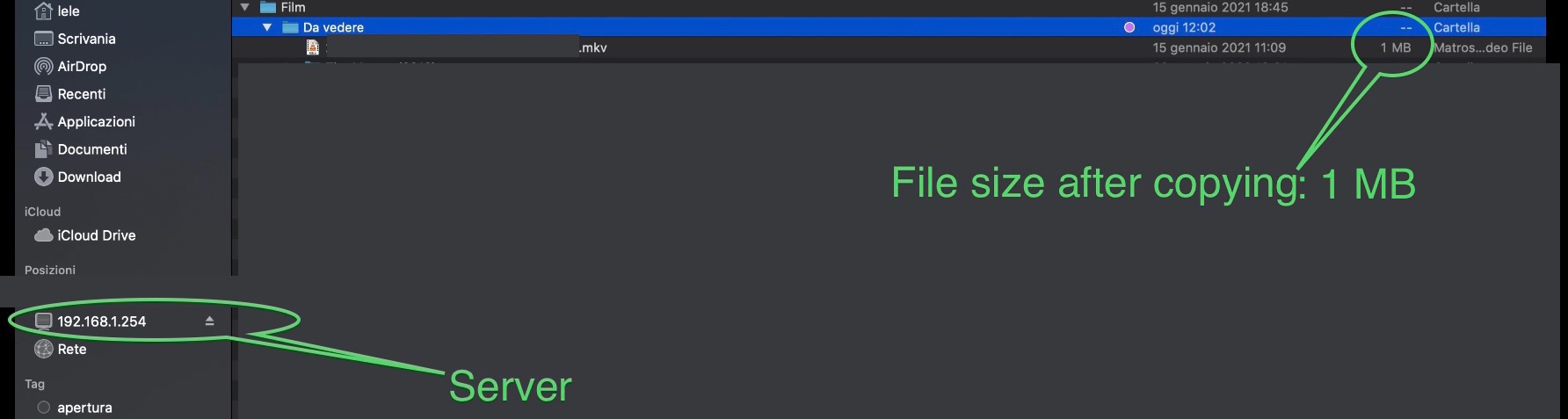 Hi, I'm having trouble copying files from my Mac to an HDD plugged to my ISP's router. The file, initially, seems to be copied but at the end its size is 1MB(!)