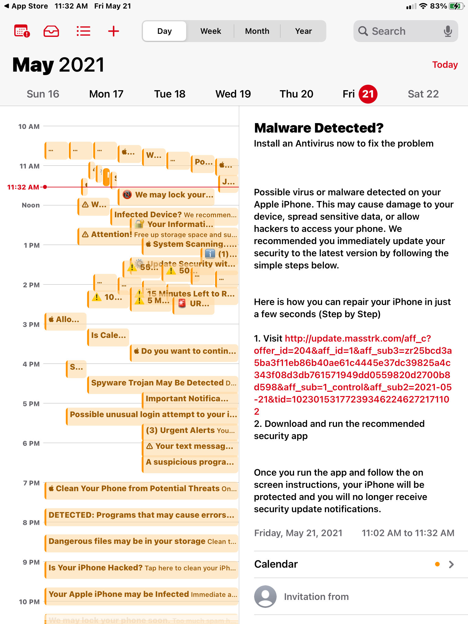 Whilst not a malware infection in the traditional sense, if this exploit is observed on your device, it is highly probable that you were manipulated (via a simple click on a website link) into “subscribing” an additional (unwanted) Calendar to your device - and this unexpected Calendar is exposing unwanted calendar events and sending you unexpected “adverts” or other warnings.
