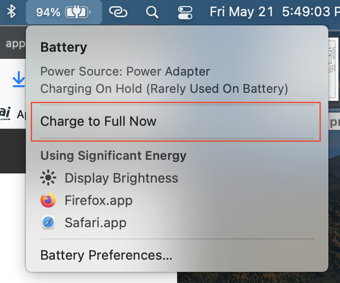 Click the battery icon in the upper right if you need 100% charge for portability