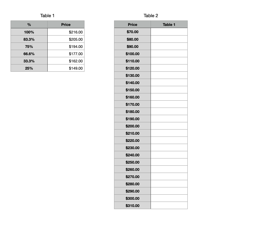 After I have manually inserted the $ values in Table 1, I would like the corresponding % from Table 1 column A to be automatically input into table 2 column B. However, you will notice that the $ values do not exactly match between the two tables therefore I only want the corresponding % value in table 1 column A to be displayed in table 2 column B if it is within +/- (10%) of the dollar value in table 1 Column A. If not display nothing in table 2 column B.