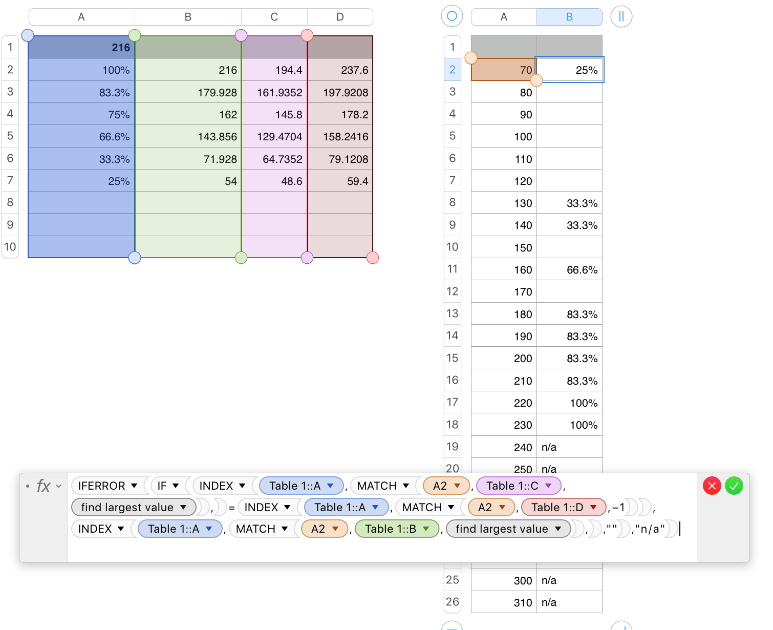 The formula uses this pair of functions, MATCH and INDEX to look up a percentage in Table 1 twice to determine if there is a match that is within the ±10% range. If the first search (of column C for a number less than or equal to the value being searched) and the second (of column D for a number greater than or equal to the value being searched) both return the same row number (and consequently the same percentage value, IF repeats the first search and returns the value it finds.