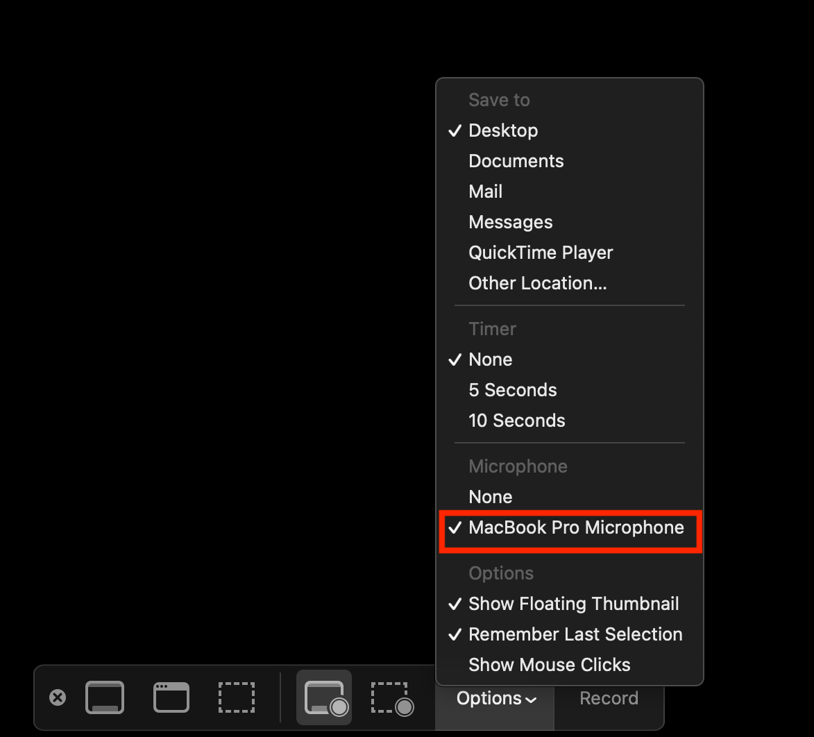 Trying to record video with screenshot - but no MICROPHONE (audio options) available - not even for internal mic?