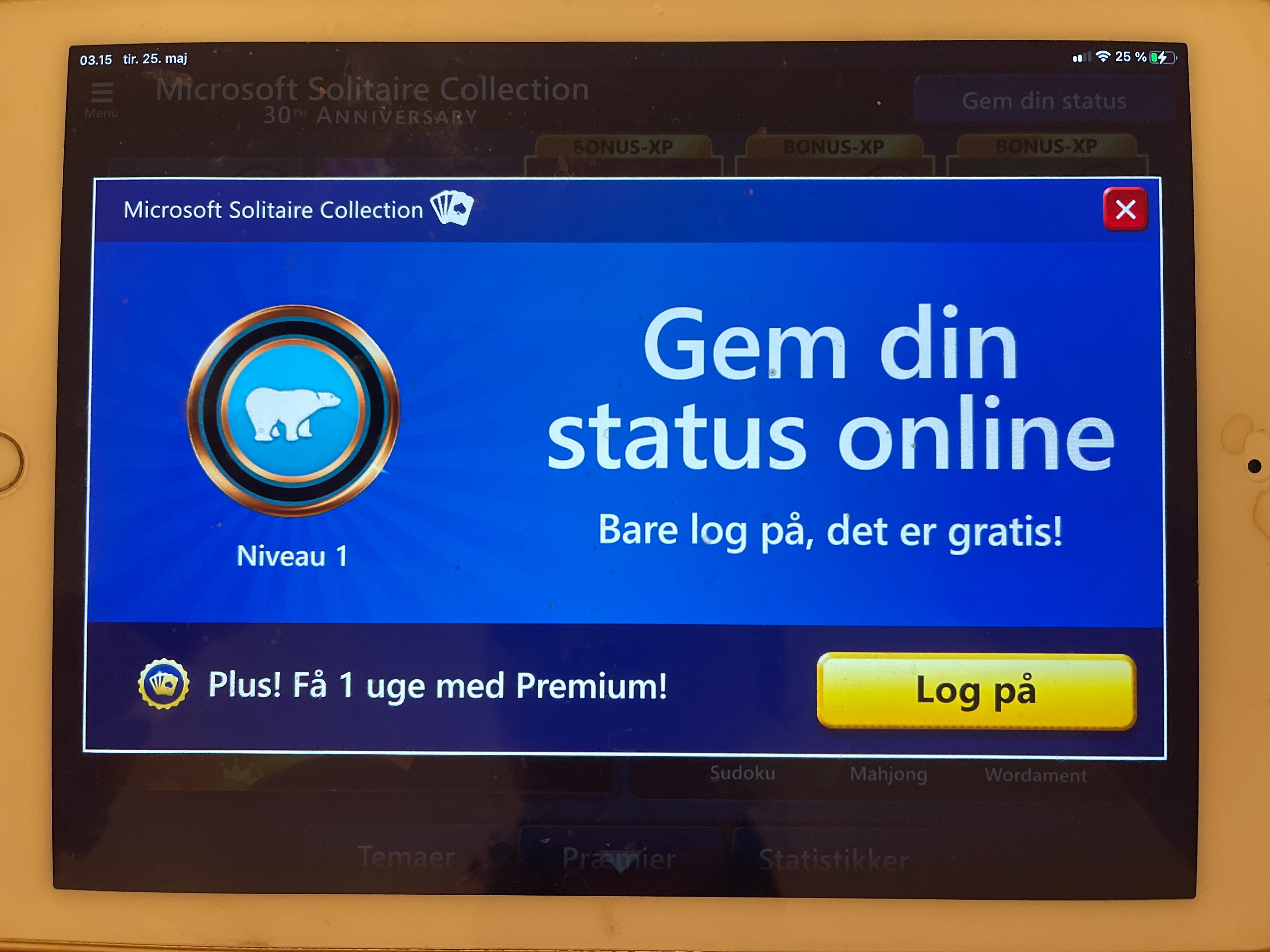 Since I logged out of Microsoft Solitaire Collection in the App, in order to log my mom in in order to let her play the game on one of my iPads, the little logon icon does not show in the right top corner of the iPad’s screen anymore. Therefore I tried to log myself off on the other iPad too, hoping that I would succeed logging her in on that iPad so that she could play, but now I have exactly the problem on both iPads. I have uninstalled and installed the Microsoft Solitaire Collection more times on both iPads, but this did not solve my problem. To the left from the little newspaper icon tap a button, that allows me to log in and get one Free week of MSC premium and in the same time, it is possible for me to save my progress in the game. I only get a message telling me, that the game could not log me in, tells me that I should try again later, visit the Microsoft Zendesk help FAQ and describe my problem referring to the Errorcode 1170000. I have visited Microsoft’s Zendesk Helpdesk Error code site more times, and I have described the issue to them but this has not solved my problem.