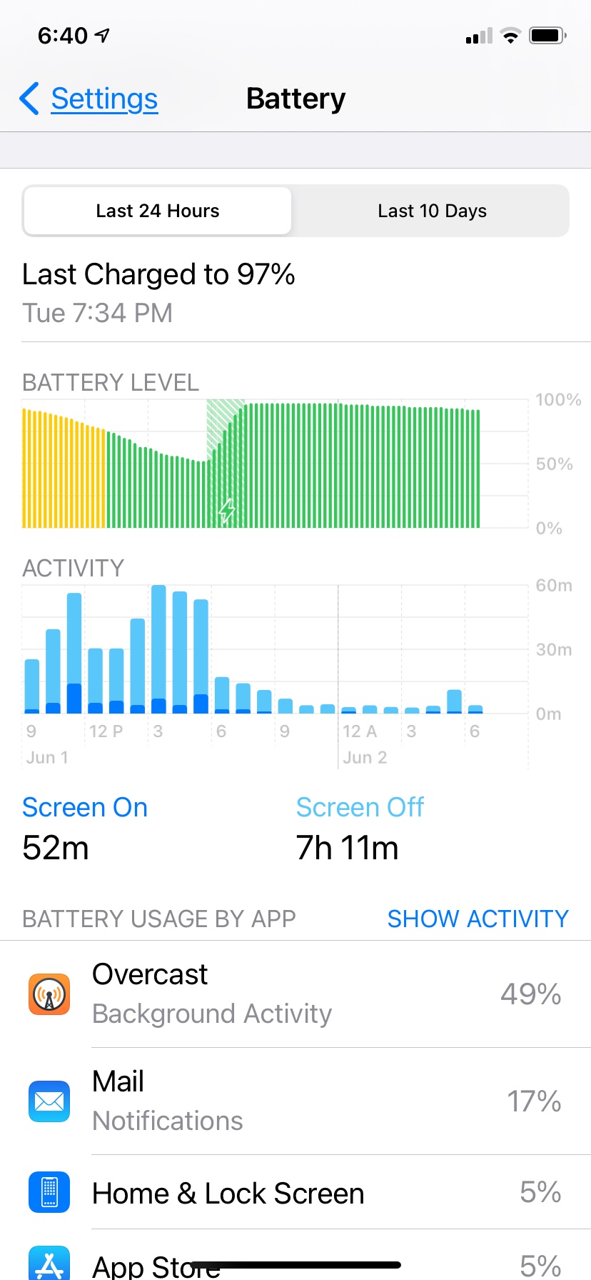 Before posting now, just to double check, I let device sit for 30 minutes again with Podcast app open but not playing and screen off. Other apps are all closed. Bluetooth is on and connected to a smart speaker. Device is connected to mobile network and home wifi. Started at 100%. Had a reminder from Alexa come in and screen came on for that. Thirty minutes later battery is still 100%. Thirty-five minutes, still 100%. Forty minutes, still 100%.