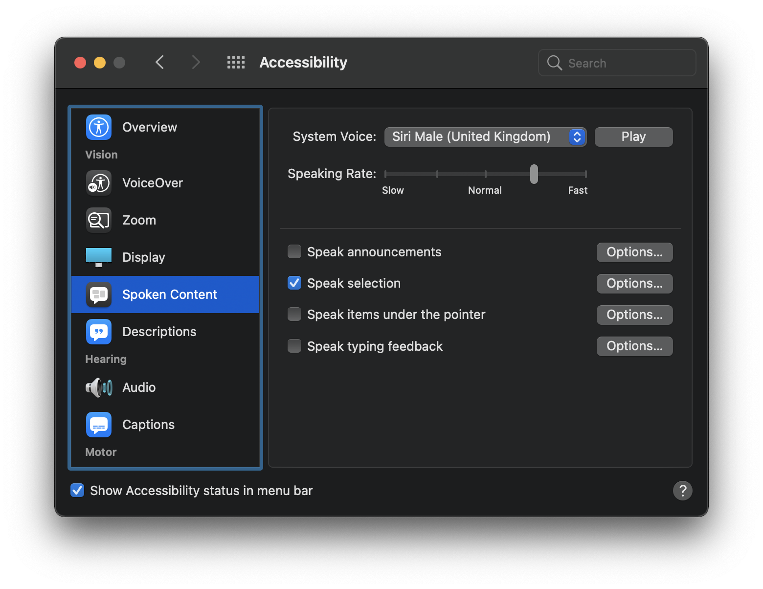 I use the Spoken Content feature a lot on my Mac to read articles and other long-form content. It's a great feature however, I find the default speed a fraction too slow. When I attempt to adjust the speaking rate in the Accessibility Settings via the slider, both the Siri Male and Siri Female voices speak at the exact same 1x speed. The same is not true for the other voices such as Daniel and Oliver. This occurs whether I attempt to adjust the speed in the Settings menu or using the Spoken Content controls on-screen while content is being spoken.