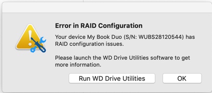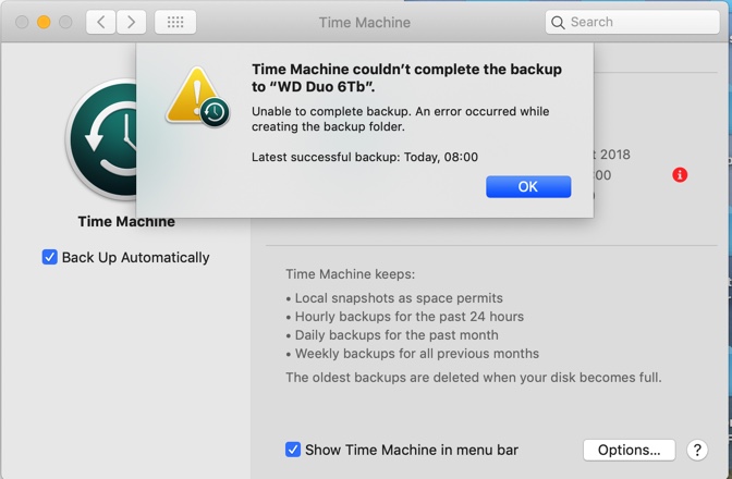 My WD My Book Duo fails with Time Machine backing up. It either produces this error or after 2 days just fails to complete.