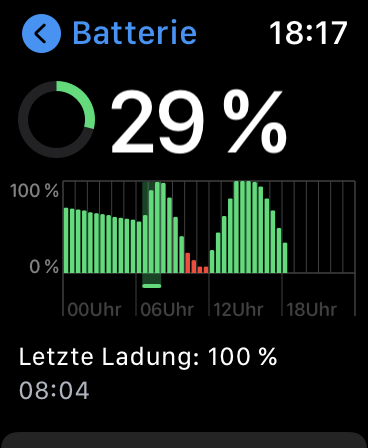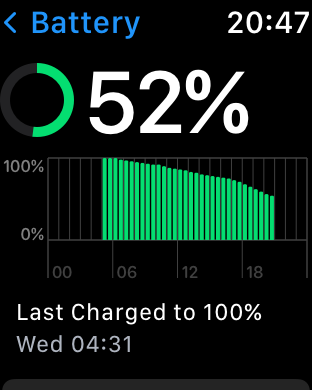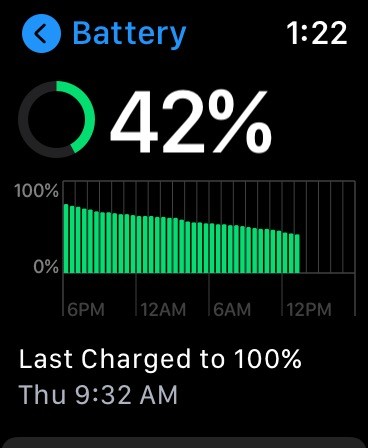 Interesting information. I accidentally left my phone at home today. When I left work my watch was at 74% battery. 12 hrs of my watch being separated from my phone and the battery dropped 26%. Now after 4 hrs with them together the battery has dropped 22%. Notice the change in discharge rate just before 1800. The higher discharge rate is what I have been seeing everyday.