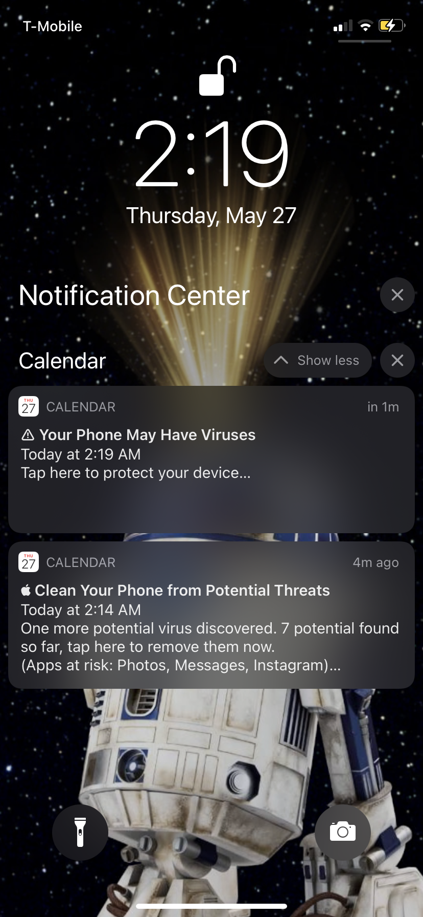 Calendar keeps sending me messages like “one more potential virus discovered.7 potential found so far tap here to remove them now “ and I don’t know what I should do