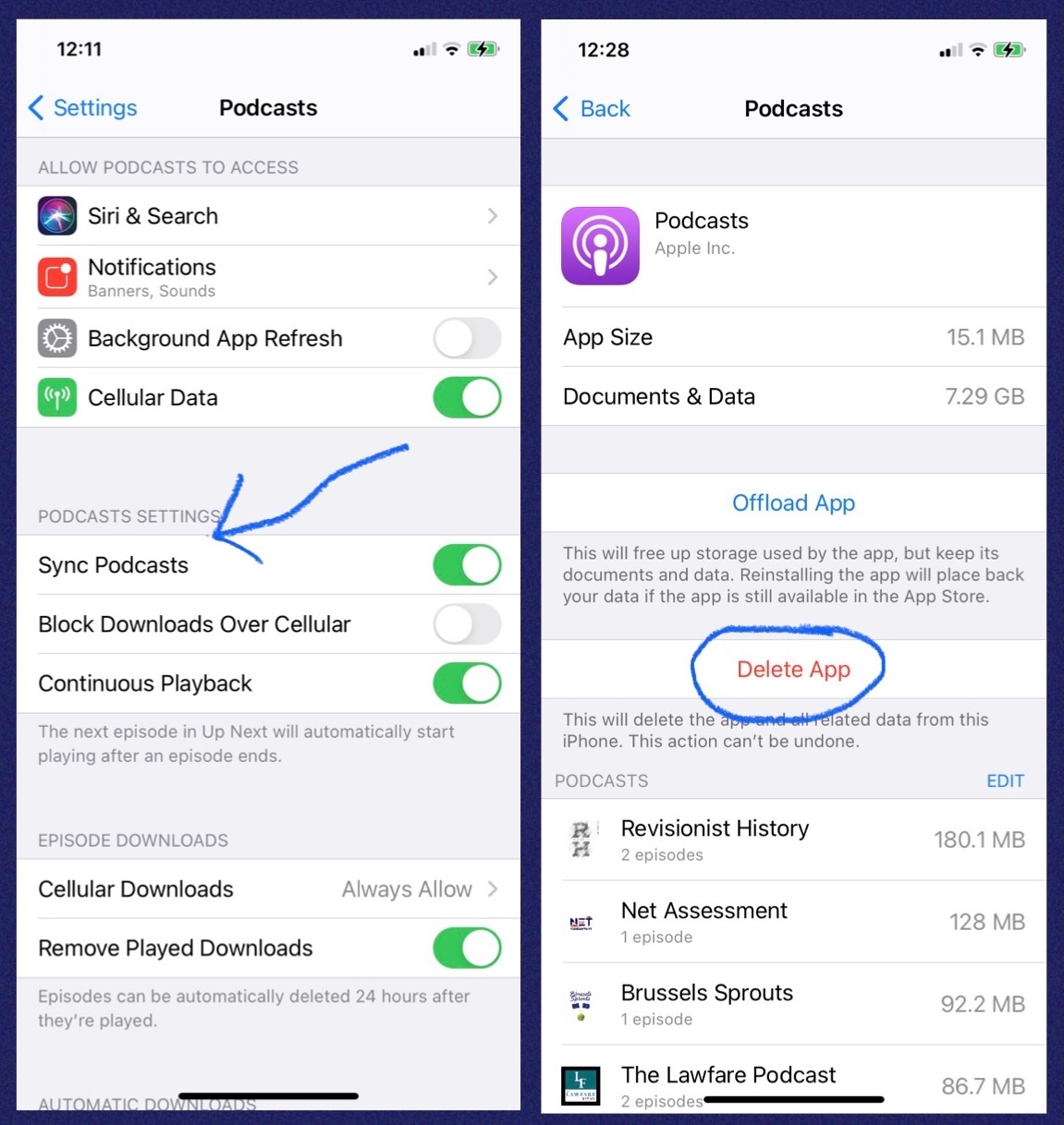 When I look at the list of episodes on the app, it shows the cloud icon next to each episode. When I click on the cloud I get the message "Unable to Download Podcast; [episode title] cannot be downloaded. Please try again later."