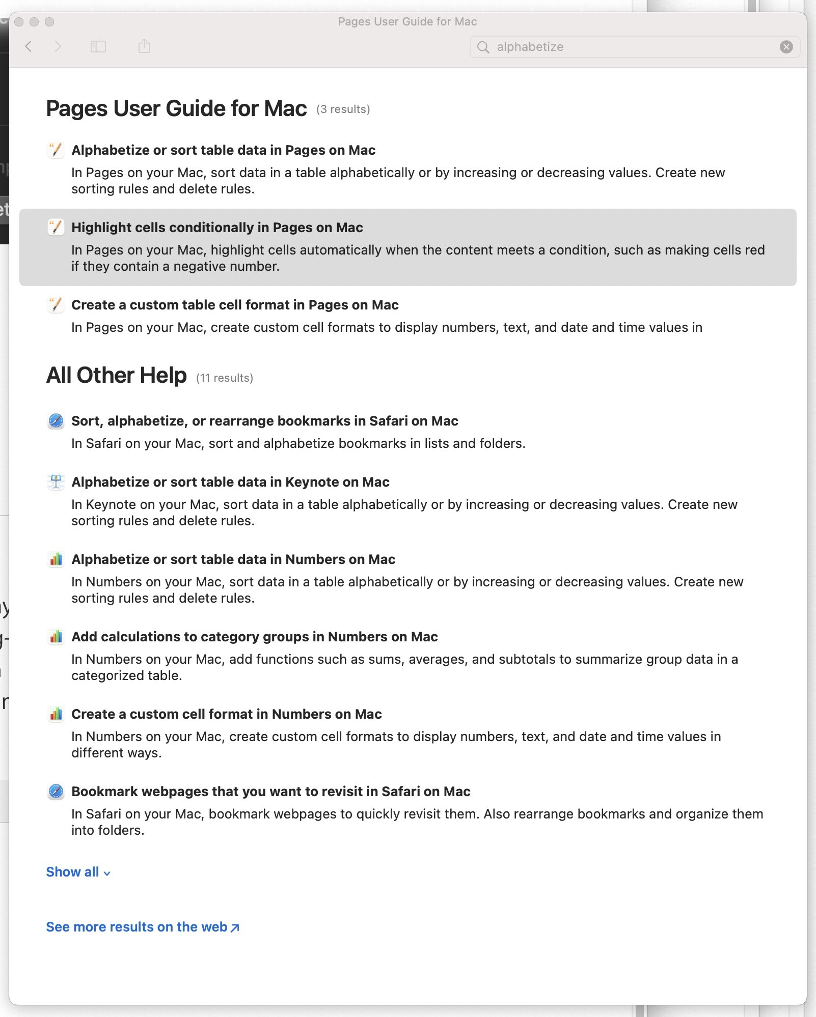 Anyway, what Apple could do to make finding things like this much easier would be to anticipate more thoughtfully what users might want to do and list them near the beginning of help files. Yes, they no doubt try to do that now--but I've been using, teaching, and reviewing word processors professionally since 1985, and they absolutely suck at anticipating what I might want to do.