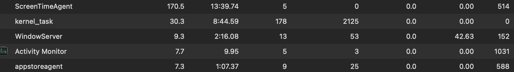 A few seconds before I took this screenshot ScreenTimeAgent was on 181, and kernel_task was on 40.