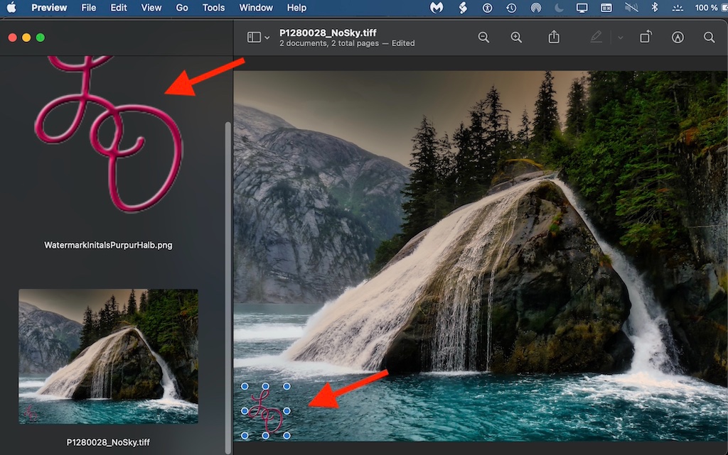 • Open your Watermark in Preview, then select all of the Watermark with ⌘A and copy it to the Pasteboard with ⌘C