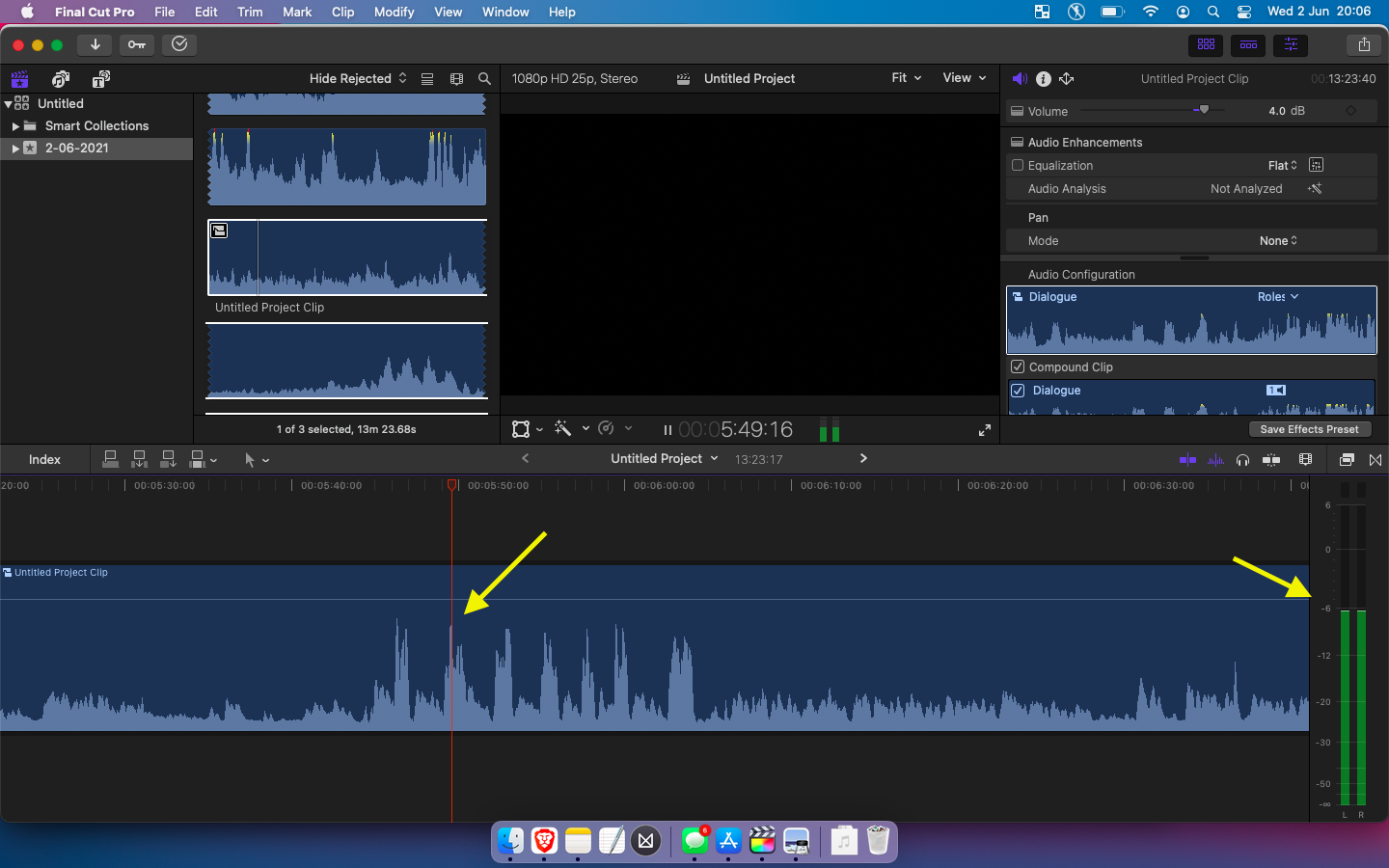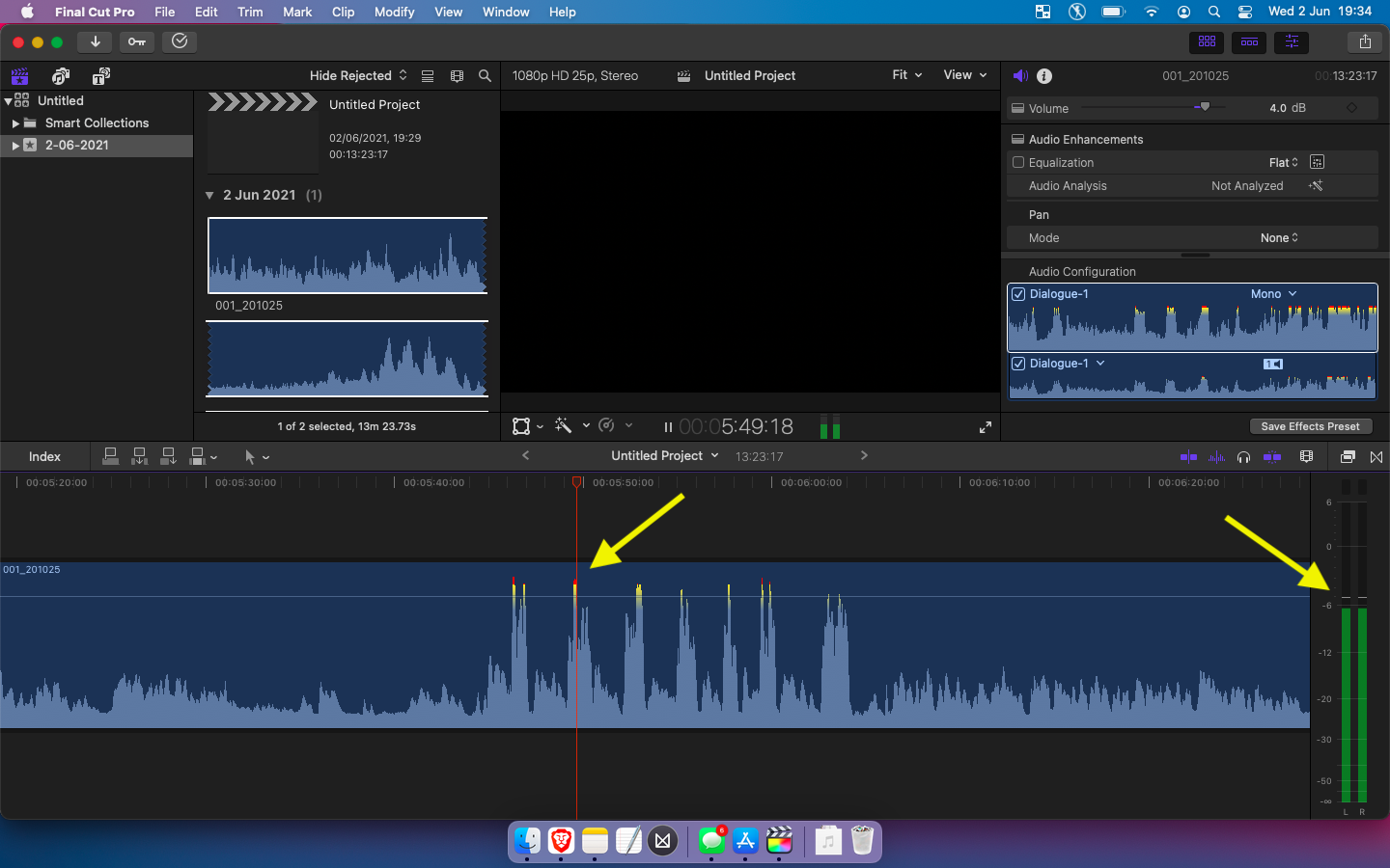 FCPX mono file waveform shows as peaking but audio monitor shows -6db